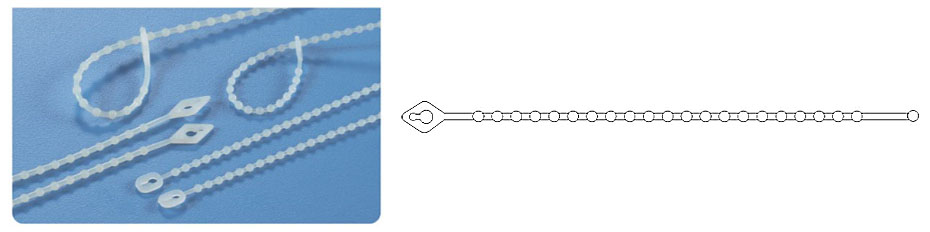 材質:UL合格之NYLON66(本色),防火等級94V-2. 用途:一般電源線之綁扎,可再松開重復使用。 Material:Nylon 66 certificated by UL. Usage:Beaded design keeps wires from shifting of slipping